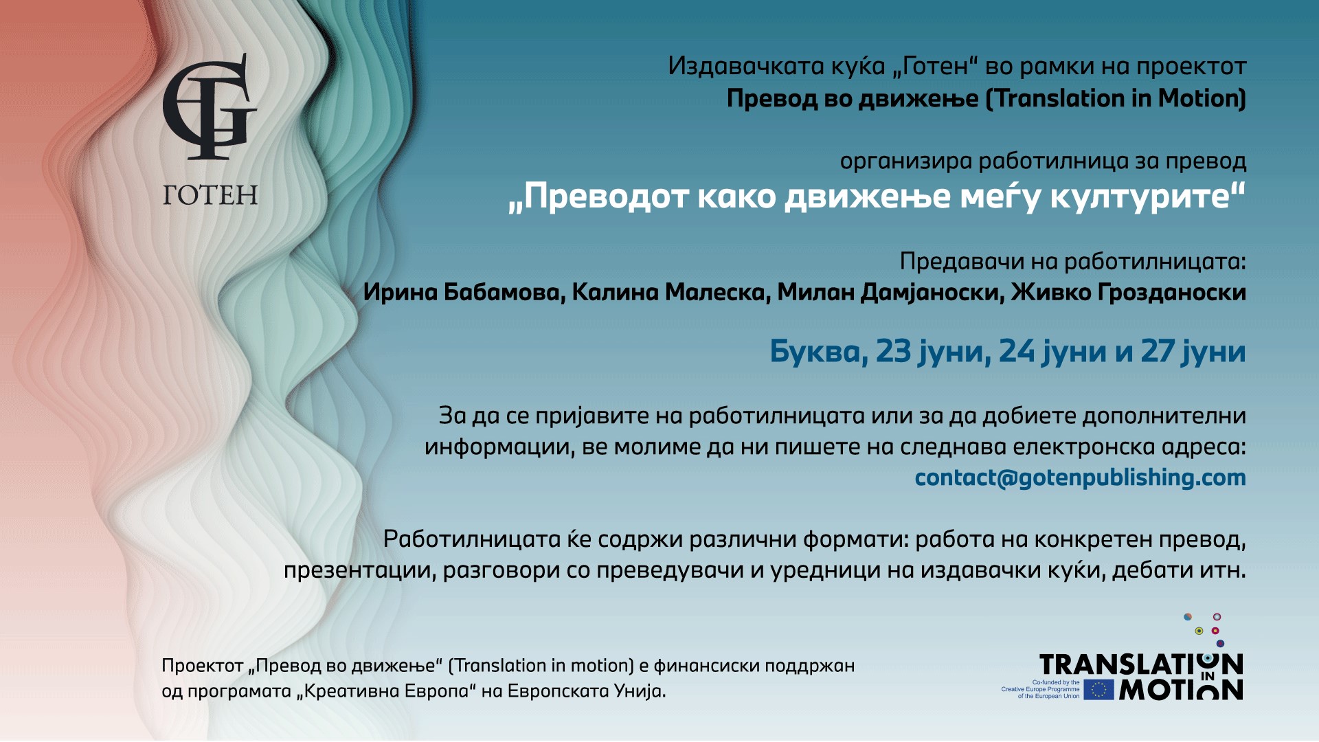Издавачката куќа „Готен“ во рамки на проектот „Превод во движење“ организира работилница за книжевен превод „Преводот како движење меѓу културите“. Работилницата ќе се одржи во кафе-книжарницата Буква, на 23, 24 и 27 јуни.
