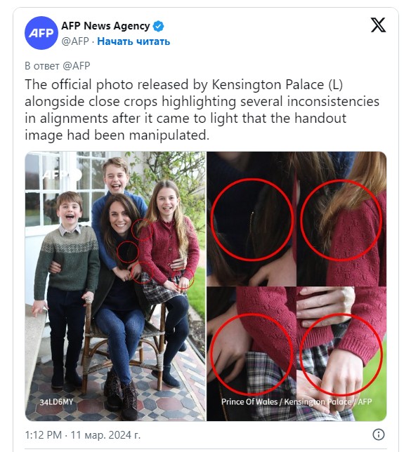 „По поблиска проверка, се чини дека изворот манипулирал со сликата“, се вели во известувањето на АП. Портпаролот на агенцијата изјави за „Телеграф“: „Фотографијата покажува недоследност во положбата на левата рака на принцезата Шарлот“. Корисниците на социјалните мрежи забележаа дека на фотографијата делумно недостасуваат ракавот и зглобот на принцезата Шарлот, принцезата од Велс не носи свршенички прстен, а го прегледувале и начинот на кој принцот Луис ги прекрстувал прстите, како и фактот дека се појавија лисја на дрво во позадина во март. АФП забележа неколку недоследности откако Кејт Мидлтон се извини.