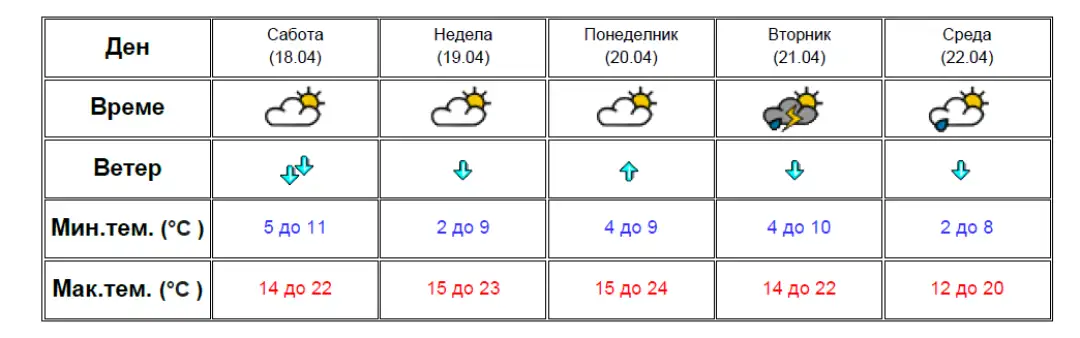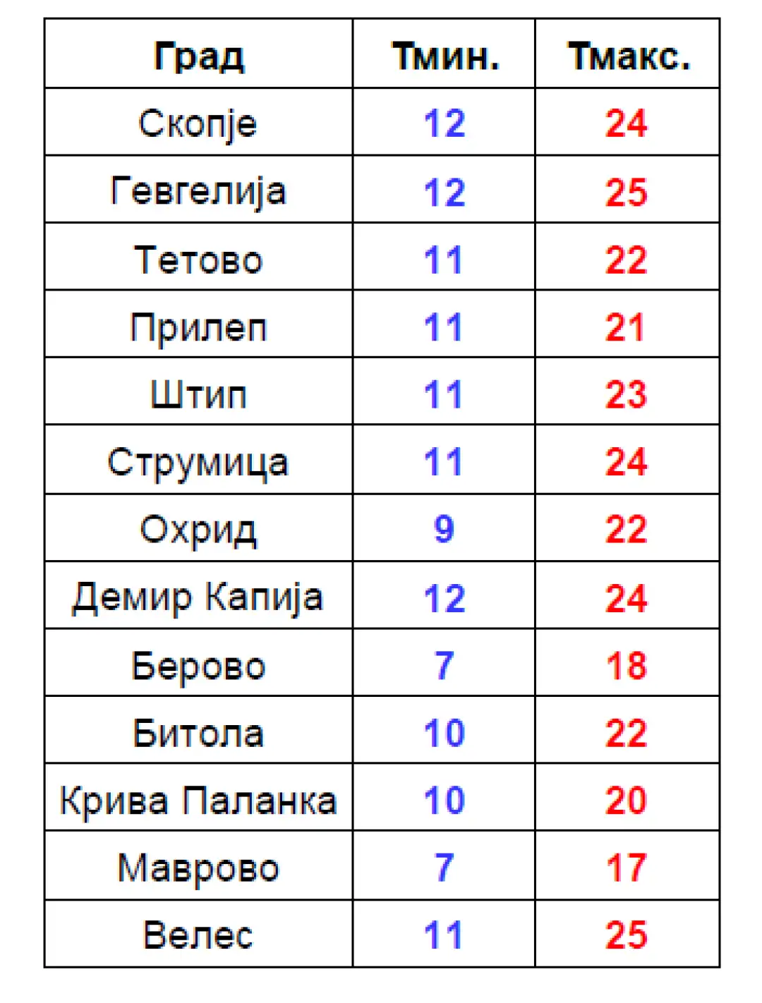 Температурата денеска ќе се движи од 7 до 25 степени Целзиусови на територија на државата. Во Скопје, од 12 до 24 степени Целзиусови.