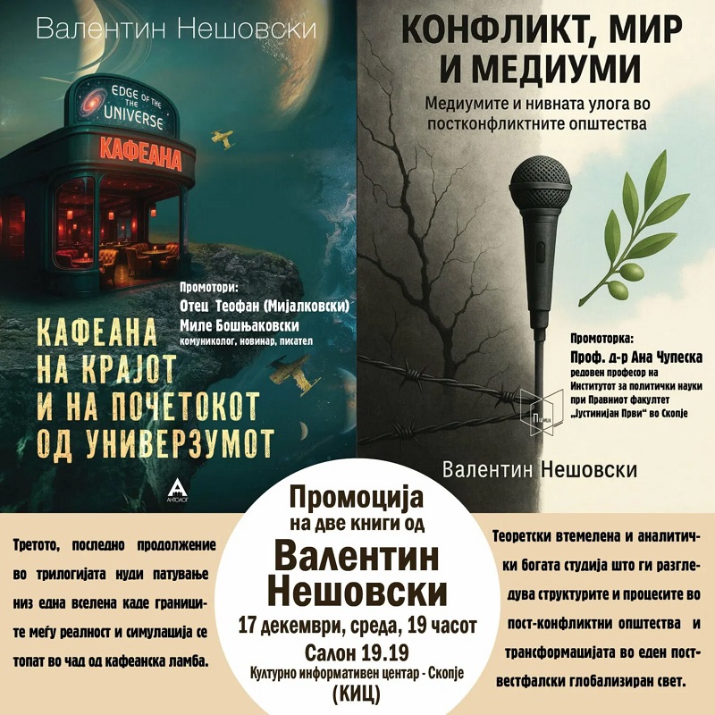 Во Културно-информативниот центар (КИЦ) во Скопје, на 17 декември (среда) во 19 часот, ќе се одржи промоција на две книги од авторот Валентин Нешовски, во Салонот 19.19.