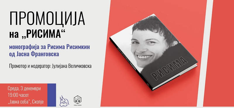 Во среда, 3 декември од 19 часот во „Јавна соба“, Скопје, ќе се одржи промоцијата на монографијата „Рисима“ од Јасна Франговска, посветена на македонската кореографка за современ танц ‒ Рисима Рисимкин. Изданието е на „ПНВ Публикации“ и објавено е со поддршка од Министерството за култура и туризам.