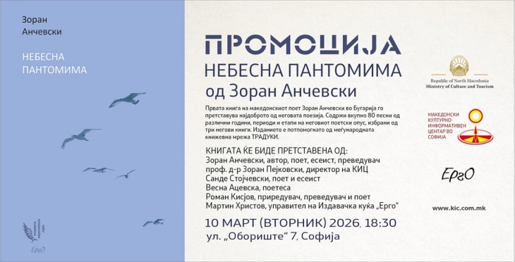 Во Културно-информативниот центар на Македонија во Софија вечер од 18.30 часот ќе биде промовирана книгата „Небесна пантомима“ од поетот, есеист и професор Зоран Анчевски, преведена на бугарски јазик од Роман Кисјов. Со оваа книга Анчевски првпат се претставува пред бугарските читатели.