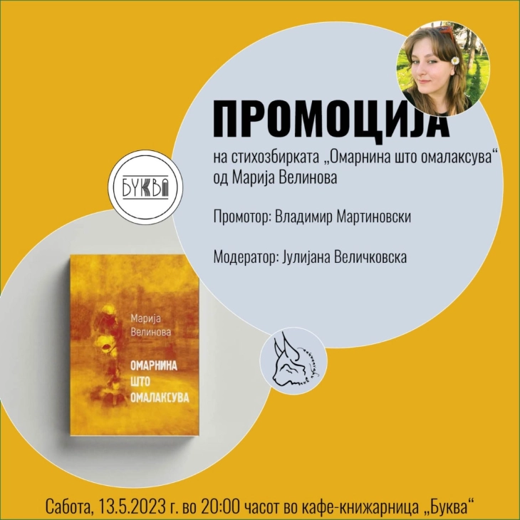 Во кафе-книжарницата „Буква“ вечер од 20 часот ќе биде промовирана стихозбирката „Омарнина што омалаксува“ од младата поетеса Марија Велинова, издание на ПНВ Публикации од Скопје. Книгата ќе ја промовира проф. д-р Владимир Мартиновски, а настанот ќе го модерира Јулијана Величковска.