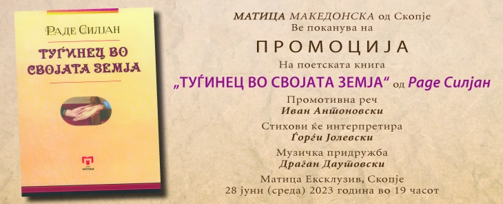 Во паркот на книгата на „Матица ексклузив“ вечер од 19 часот ќе биде промовирана стихозбирката „Туѓинец во својата земја“ од Раде Силјан.