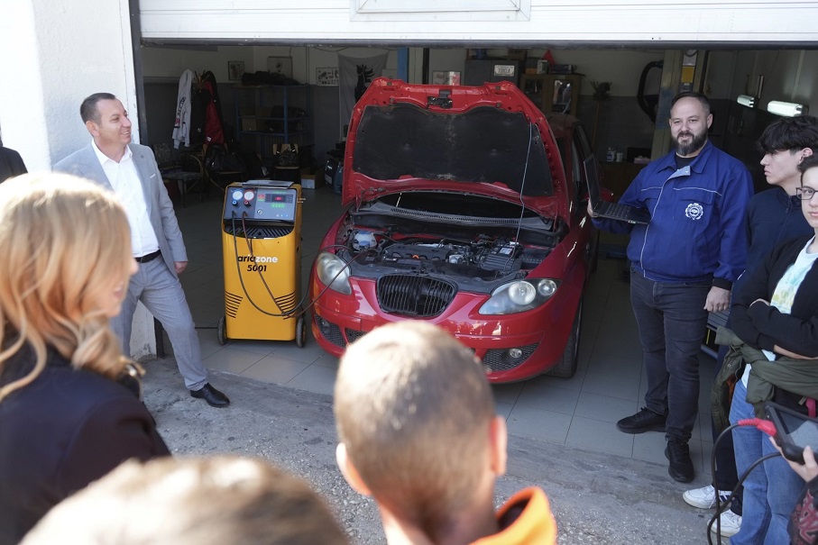 Арсовска со професорите и учениците во училишната работилница беа дел од презентацијата на подготвените практични задачи за новиот образовен профил за техничари за возила на алтернативен погон.