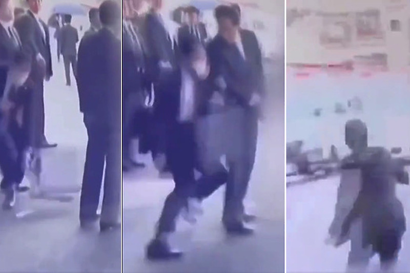 На видеото може да се види како се фрла некаква експлозивна направа кон Кишида, која еден од неговите обезбедувачи најпрво ја запира со актовка, а потоа ја клоца.