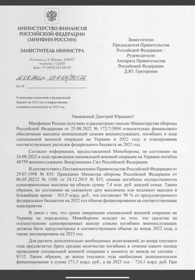 Во протеченото писмо од руското Министерство за финансии се вели дека заклучно со 28 август на семејствата на починатите руски војници што се борат во Украина им се исплатени 361,4 милијарди рубли. Со оглед на тоа дека за секоја загинат војник руската држава се обврза да плати помош на семејствата од 7,4 милиони рубли, тоа значи дека за првпат официјално се потврдува дека во Украина загинале 48.759 руски војници.
