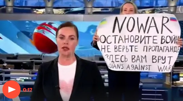 Демонстрантката, кој беше идентификуван од руските медиуми како вработена во Канал 1, Марина Овсијаникова, држеше и натпис на руски што може да се протолкува како: „Не верувајте во пропагандата. Тие ве лажат овде“.