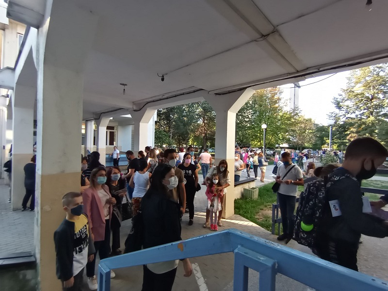 Сепак, додека децата послушно се редат во ред, секое има маска на лицето, родителите, бабите, дедовците кои дојдоа да ги испратат учениците стоеја насекаде во училишниот двор. Не се внимаваше на дистанцата, а некои и не носеа маски на лицето, иако очигледен беше метежот и неможноста да се држи растојание.
