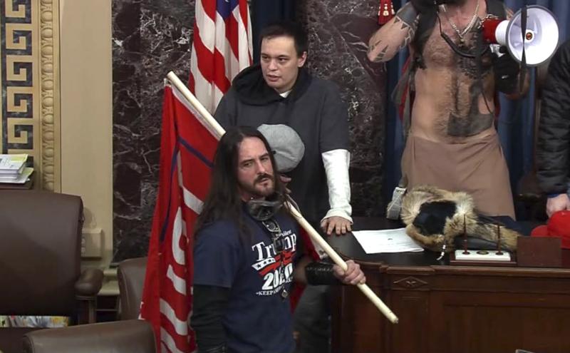Хоџкинс беше снимен облечен во маица „Трамп 2020“, со знаме на рамото и наочарите околу окото околу вратот, и беше виден како прави селфи со самоопишаниот „шаман“ во шлем со рог и други бунтовници зад него.