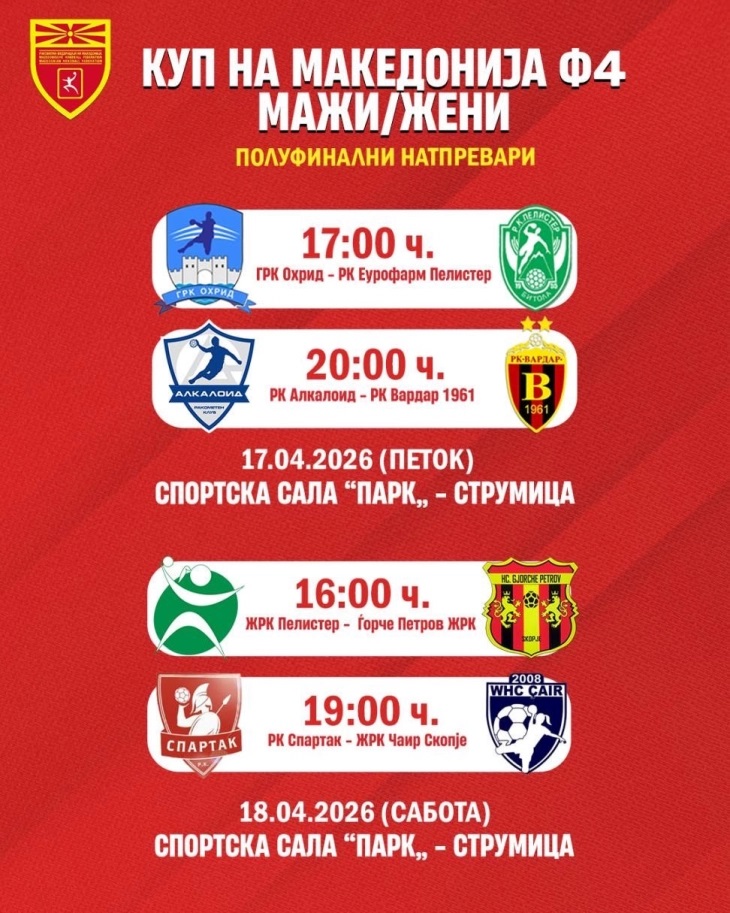Со еден билет ќе можат да се следат полуфиналните дуели во двете конкуренции (мажи и жени). Кај мажите на 17.април (петок) играат: ГРК Охрид – Еурофарм Пелистер и Алкалоид – Вардар, а на 18.април (сабота) се играат дуелите кај жените: ЖРК Пелистер – Ѓорче Петров ЖРК и Спартак – Чаир Скопје.