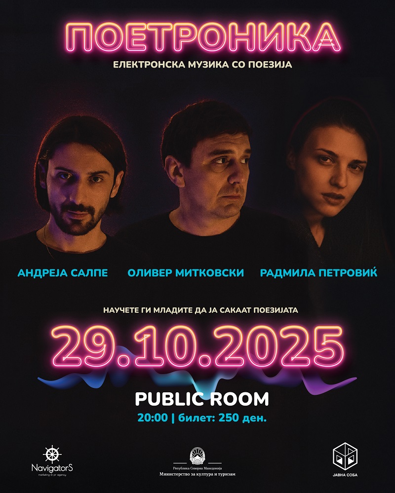 Поетесата Радмила Петровиќ, еден од најсвежите гласови на современата српска поезија, ќе настапи заедно со актерот Оливер Митковски и електронскиот продуцент Андреја Салпе во рамки на новото издание на уметничкиот проект „Поетроника за млади“. Настанот ќе се одржи вечерва во 20:00 часот во Јавна соба.