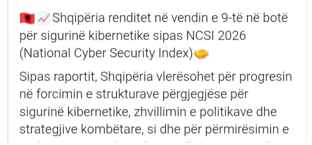 “Албанија е рангирана на 9-то место во светот за сајбер безбедност според NCSI 2026 (Национален индекс за сајбер безбедност). Според извештајот, Албанија е високо оценета за нејзиниот напредок во зајакнувањето на структурите одговорни за сајбер безбедноста, развојот на национални политики и стратегии”, пишува Рама.