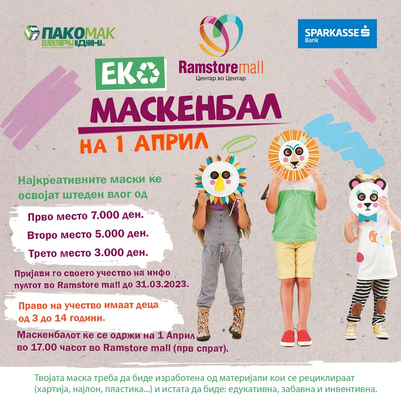 На огромно задоволство на сите дечиња, „Рамстор мол“ во соработка со „Шпаркасе банка“ и „Пакомак“, традиционално и оваа година го организираат најзабавниот Еко маскенбал!