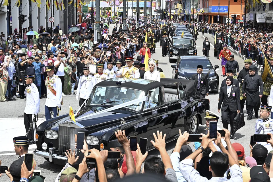 За време на неделната поворка, младенците стоеја на задниот дел на Ролс-Ројс со отворен покрив додека им мавтаа на толпата низ улиците за да ги погледнат популарниот принц и неговата невеста. Помпата и раскошот на нивниот свадбен фестивал донесе многу возбуда во малиот султанат од 450.000 луѓе.