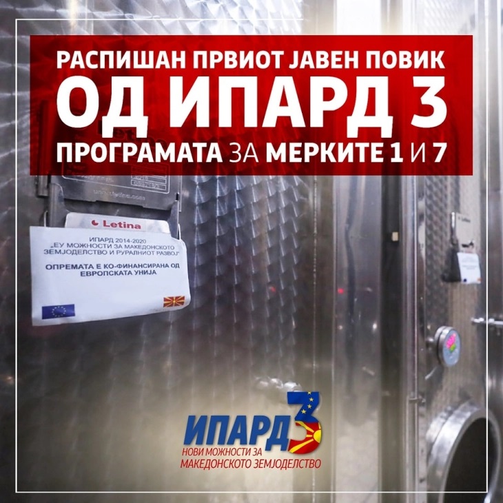 Распишан е првиот јавен јавен оглас за мерките 1 и 7 од ИПАРД 3 проектот, наменет за модернизација во земјоделството.