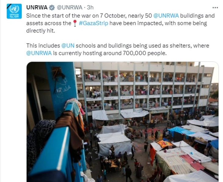 „Ова ги вклучува училиштата и зградите на ОН кои се користат како засолништа, каде што УНРВА моментално сместува околу 700.000 луѓе“, соопшти УНРВА на социјалните мрежи.