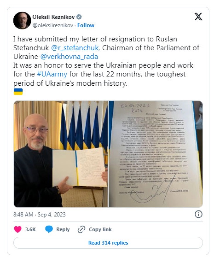 – Го поднесов моето писмо со оставка до Руслан Стефанчук, претседател на Парламентот на Украина. Ми беше чест да му служам на украинскиот народ и да работам за (украинската армија) во изминатите 22 месеци, најтешкиот период од модерната историја на Украина, наведе Резников.