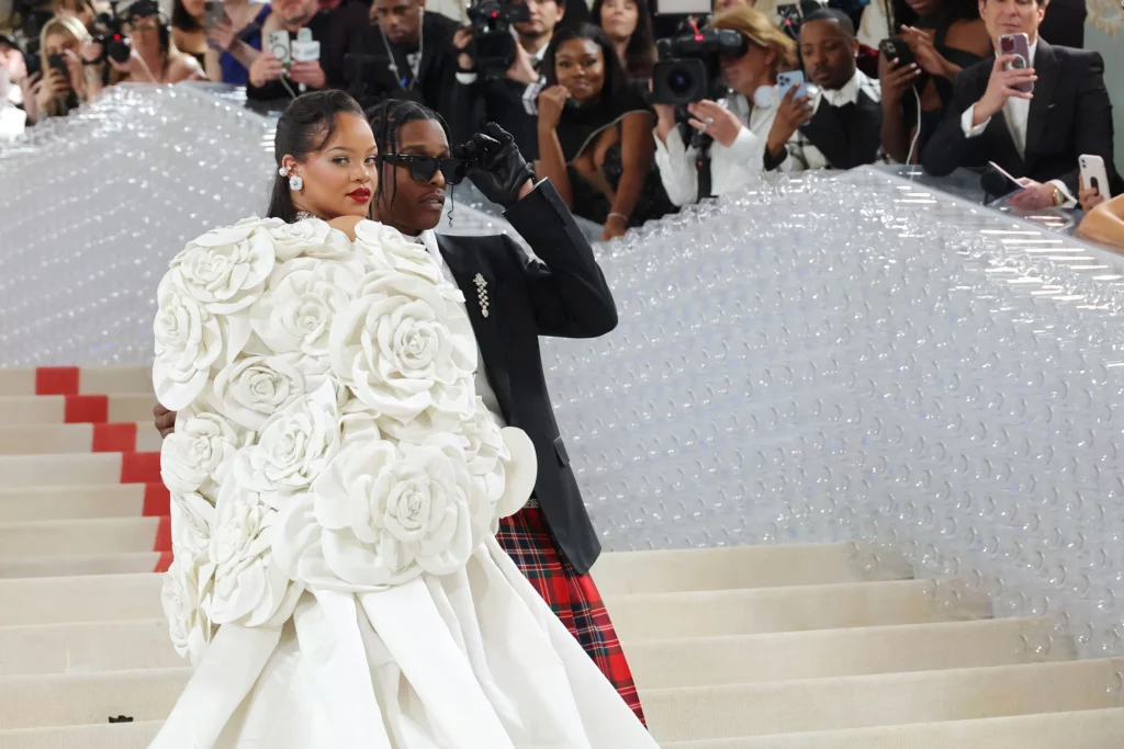Ријана и A$AP Роки доцнеа синоќа на Мет Гала во 2023 година. Пристигна во предимензионирана бунда која потекнува од колекцијата на реди ту веар облека за есен/зима на Fendi од 1997 година. Под неа се криеше волуминозна бела тоалета во горниот дел и на главата украсена со камелии кои , како твидот и логото со двојно Ц, се белег на брендот Шанел, со кој Лагерфелд работеше од 1983 година до неговата смрт во 201 9година.Во иста бела боја беа и шпицастите салонки со некои женствени допири, вклучувајќи врвки и убава камелија закачена на зашилениот дел. Од накит имаше големи обетки со дијаманти, во облик на камелии, и чокер ѓердан со повеќе редови бисери, сѐ во стилот на „Шанел“.