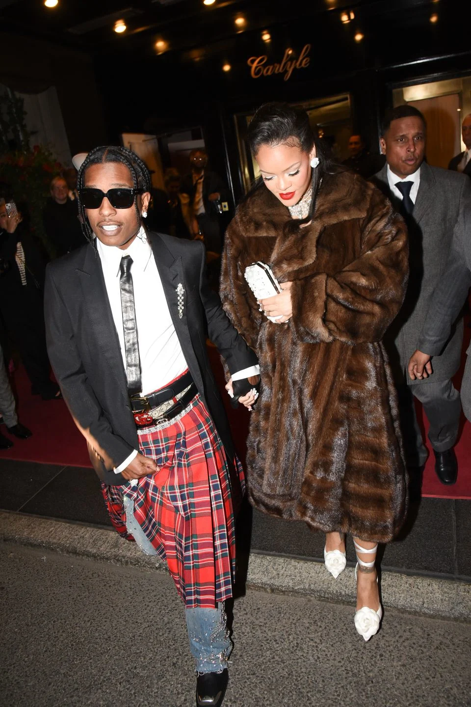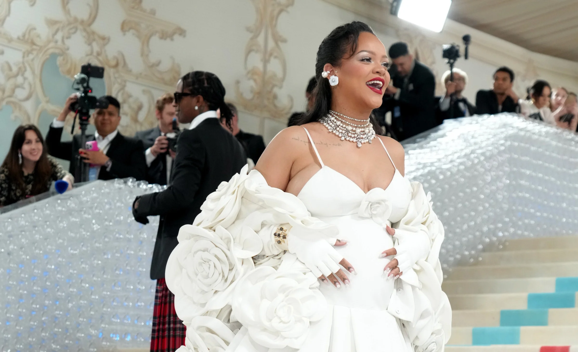 Ријана и A$AP Роки доцнеа синоќа на Мет Гала во 2023 година. Пристигна во предимензионирана бунда која потекнува од колекцијата на реди ту веар облека за есен/зима на Fendi од 1997 година. Под неа се криеше волуминозна бела тоалета во горниот дел и на главата украсена со камелии кои , како твидот и логото со двојно Ц, се белег на брендот Шанел, со кој Лагерфелд работеше од 1983 година до неговата смрт во 201 9година.Во иста бела боја беа и шпицастите салонки со некои женствени допири, вклучувајќи врвки и убава камелија закачена на зашилениот дел. Од накит имаше големи обетки со дијаманти, во облик на камелии, и чокер ѓердан со повеќе редови бисери, сѐ во стилот на „Шанел“.