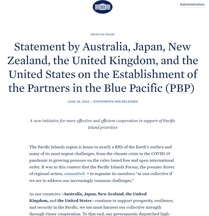 „Ние сме обединети во нашата заедничка определба да го поддржиме регионот населен со народите на Пацификот. Ние сме, исто така, обединети во начинот на кој ја следиме таа визија – во согласност со принципите на пацифичкиот регионализам, суверенитет, транспарентност, одговорност и, пред се предводени од Пацифичките Острови“, соопшти Белата куќа.