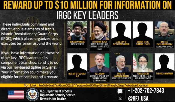 Програмата „Награди за правда“ (Rewards for Justice) на Стејт департментот на САД повика на информации за „иранските терористички лидери“, вклучувајќи го и Моџтаба Хамнеи.