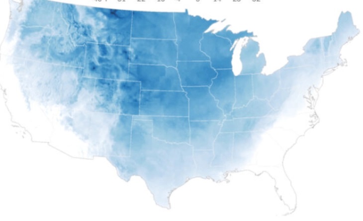 На Карпестите Планини, американскиот среден запад и централниот дел на САД измерени се температури и до минус 34 Целзиусови степени.