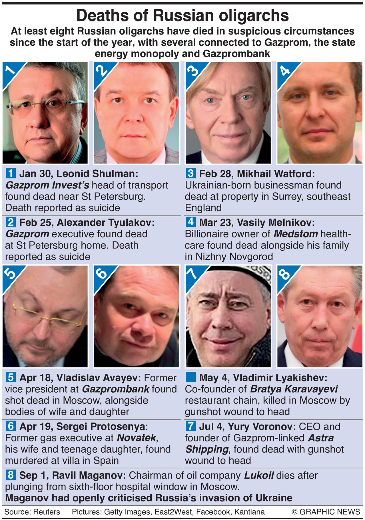 Сепак, смртта на Равил Маганов, последната во серијата чести сомнителни смртни случаи на луѓе кои или „неправилно“ ги користеа наклоните на Путин или му беа трн во око – или дури и двете – привлече најголемо внимание на медиумите. Уште најмалку шест други руски олигарси загинаа под чудни околности од почетокот на конфликтот во Украина, а заедничко им е тоа што имаа блиски врски со Кремљ, огромно богатство, поврзаност со трговијата со руски гас и антивоен став за инвазијата на Кремљ врз Украина.Ова ги зголеми сомнежите на меѓународните истражители, кои почнаа да веруваат дека овие смртни случаи всушност може да бидат исценирани самоубиства или убиства. Сè започна во Санкт Петербург во пресрет на војната.