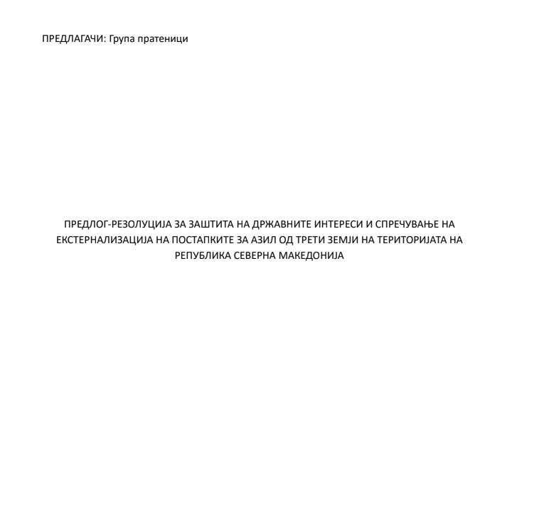 3. СЕ КОНСТАТИРА ДЕКА ДРЖАВАТА НЕМА КАПАЦИТЕТИ И СОЦИЈАЛНА КОХЕЗИЈА – Државата не располага со социјални, економски и безбедносни капацитети за да стане центар за процесирање на азил за потребите на други, далеку побогати држави. Прифаќањето на таков товар би ја загрозило стабилноста и би предизвикало несогледливи последици за внатрешната социјална кохезија.