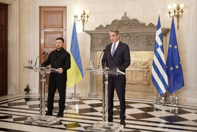 Зеленски, како на средбата со грчкиот претседател, така и на средбата со Мицотакис се заблагодари за грчката поддршка.
