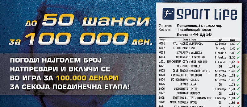 Во Sport Life стартуваше акцијата за најмногу погодени натпревари на тикет: „до 50 шанси за 100 000 денари“ . Истата ќе трае од 31 јануари до 27 февруари оваа година, и ќе се одвива низ 4 неделни етапи, од понеделник до недела. Во тој период, во секоја одделна етапа, Sport Life ќе доделува вредни подароци за првите тројца играчи со најголем број погодени натпревари на еден тикет, независно дали е тикетот добитен или недобитен.