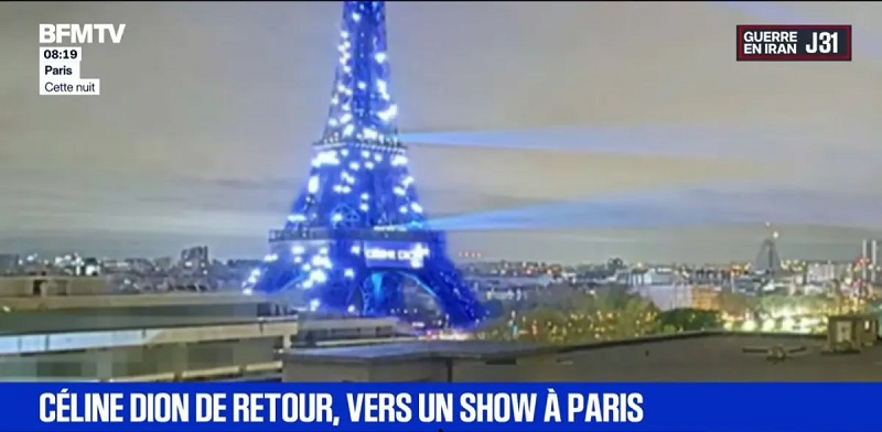 Париз – Ајфеловата кула беше осветлена во посебни бои, синоќа, со зборовите „Селин Дион“, „Париз“ и „Подготвена сум“, а еден вид светлосно шоу во чест на враќањето на канадската пејачка на сцената во француската престолнина беше снимено од надзорна камера недалеку од Трокадеро.