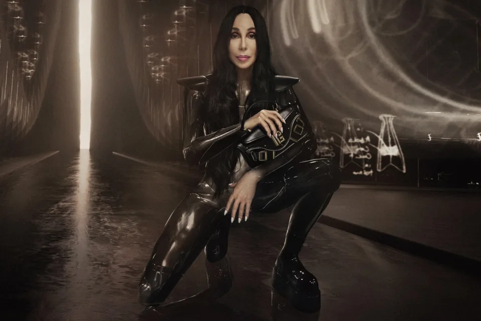 76-годишната поп-ѕвезда блесна во кампањата како футуристичка божица облечена во лакиран комбинезон со истакнати раменици.