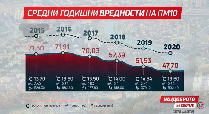 Бројките покажуваат дека последните четири години, нивото на ПМ10 честички е во постојан пад, а на годишно ниво количеството на овие честички дојдоа речиси до граничната вредност од 40 μg/m3. Ако во 2016 имало 71,91 ПМ10 μg/m3, во 2020 беа 47,70 ПМ10 μg/m3. Иако се верува дека метеоролошките прилики се тие кои значително влијаат на квалитетот на воздухот, на годишно ниво, брзината на ветерот и температурата биле со речи си константни вредности, а количеството на врнежи не е пропорционално со падот на загадувањето.
