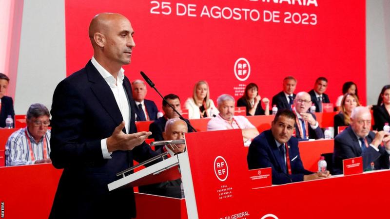 Шпанската фудбалска федерација (РФЕФ), составена од 19 регионални сојузи, побара синоќа „моментална оставка‘ од претседателот Луис Рубиалес (46) бидејќи ја бакна в уста фудбалерката Џенифер Ермосо (33) за време на доделувањето на златните медали на неодамнешното Светско првенство.