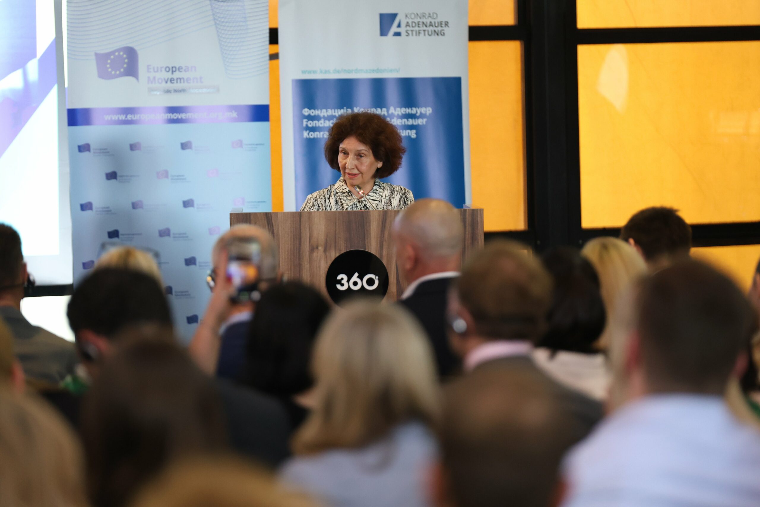 Претходно во говорот таа порача дека Европската унија е единство на различности, а ние како мала земја заслужуваме да бидеме почитувани како и сите останати, што подразбира дека и за нас треба да важат истите критериуми за влез во Унијата, како и за другите. Таа нагласи дека нејзиното барање за гаранции од италијанскиот претседател Серџо Матарела за нашиот пат во Европската унија, дадено за време на посетата на Ватикан, не било пренесено како што треба.