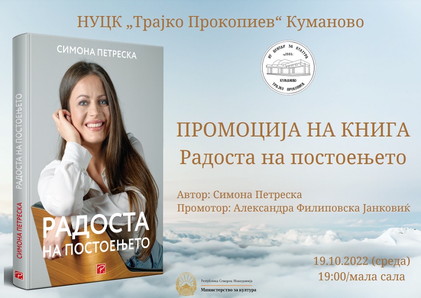 На 19 октомври (среда), од 19 часот, во Центарот за култура „Трајко Прокопиев“ во Куманово, ќе се одржи промоција на првата книга на Симона Петреска – „Радоста на постоењето“ („Паблишер“), позната манекенка, а сега мотиватор и животен тренер. Книгата ќе ја промовира Александра Филиповска Јанковиќ.