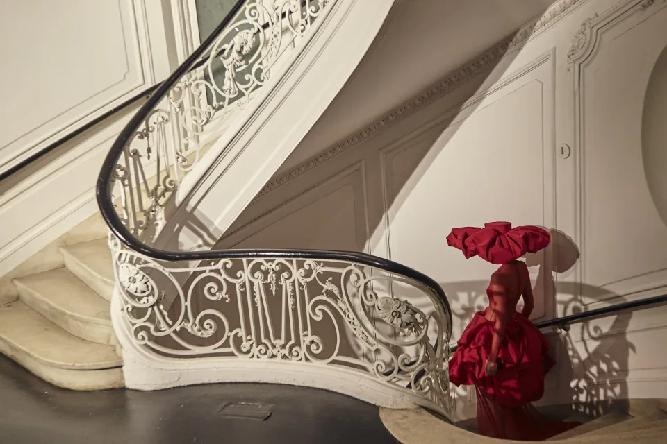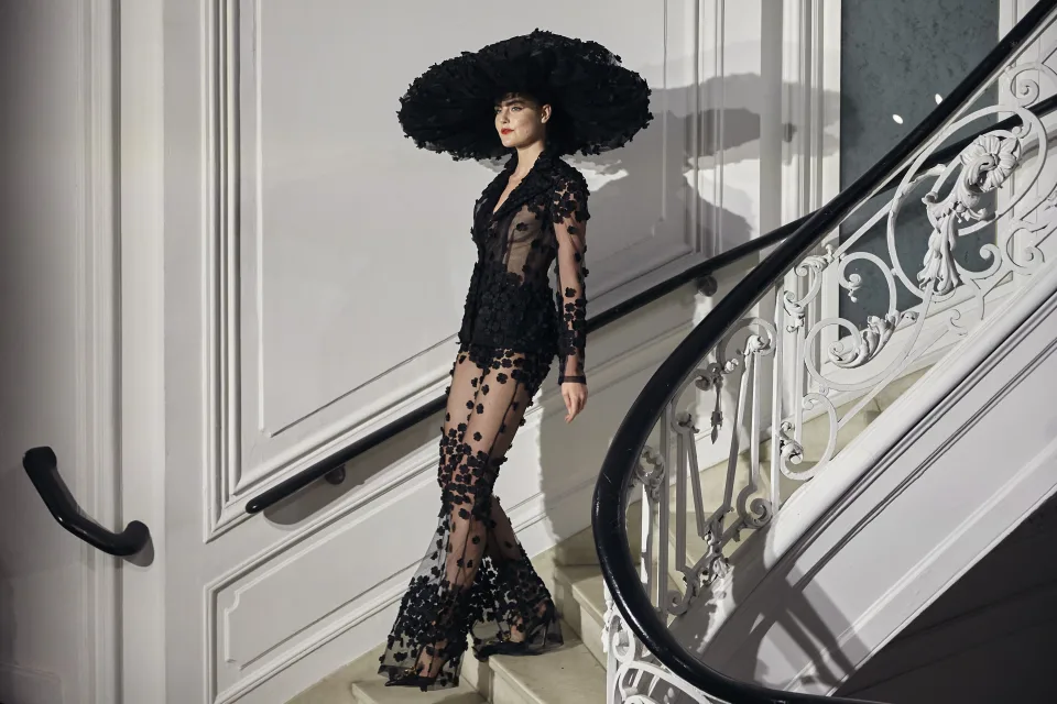 Шапките со ултра широк обод го украдоа шоуто во црна, кралско сина и светло црвена боја. Имаше многу сјај и асиметричен сет од огромни ѕвончести ракави со нивоа на еден вечерен фустан со висок врат во бело. Едниот ракав почнуваше од рамото, а другиот од лактот.