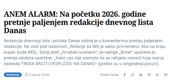 Асоцијацијата на српските независни електронски медиуми (АНЕМ) денеска објави дека редакцијата на дневниот весник „Данас“ добила закана со смрт во коментарите за веста за решението за српската Нафтена индустрија, во која било наведено дека „треба да се фрли експлозиви“ врз редакцијата.