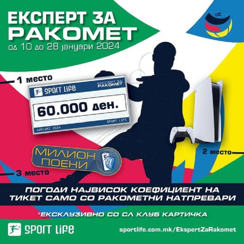 Од 10-ти до 28-ми јануари 2024 година, во обложувалниците „Sport Life“ ќе се одвива акцијата „ЕКСПЕРТ ЗА РАКОМЕТ“, во знакот на европското ракометно првенство за мажи на ЕХФ – ЕУРО 2024.