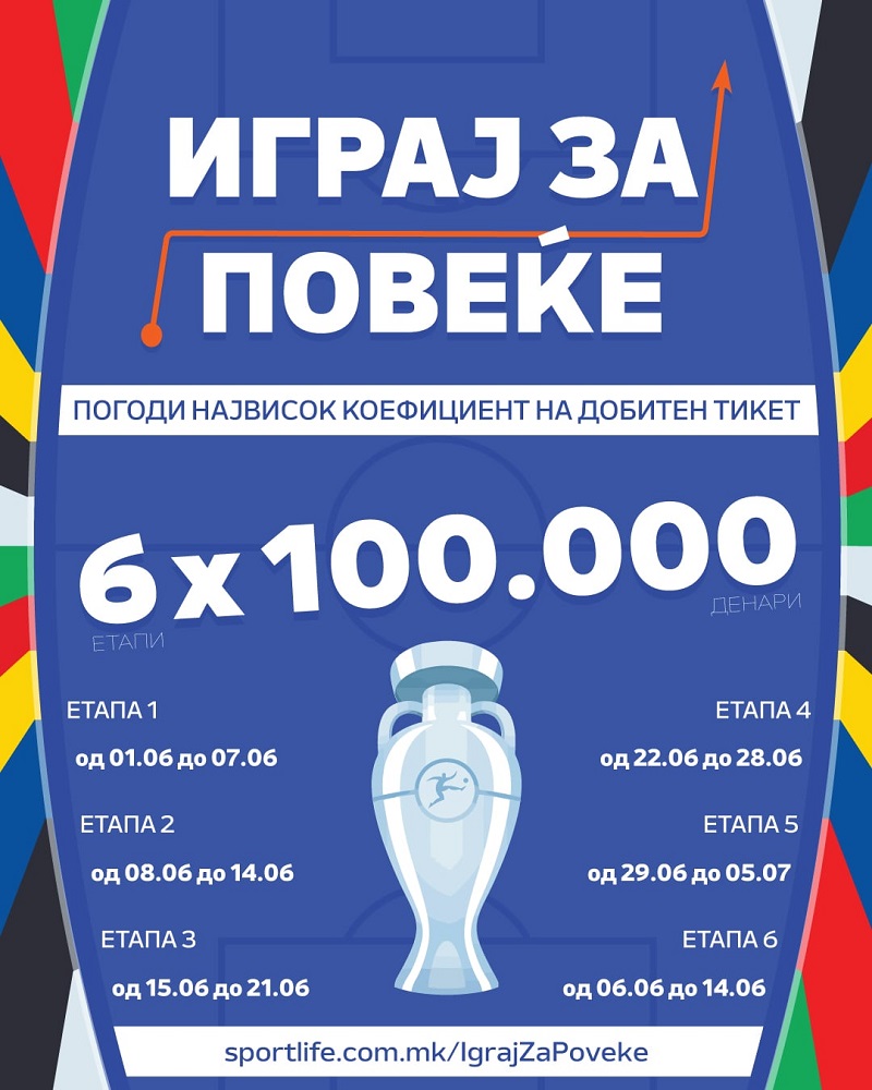 Новата акција на обложувалниците „Sport Life“ – „Играј за повеќе“, ќе се одвива од 1-ви јуни сè до 14 јули, во шест неделни етапи, со премија од 100.000 денари за секоја етапа. Премијата ќе ја освои играчот со највисок погоден коефициент на добитен тикет, уплатен со приложување на СЛ клуб картичката.