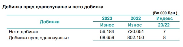 Компанијата исплати солидарен данок од дури 4,17 милиони евра, што ја сведе добивката пред оданочување на 1,1 милиони евра и е значително пониска од остварената во истиот период од 2022 година