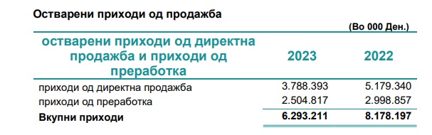 Во овој период се остварени приходи од работење во износ од 6,33 милијарди денари, од кои приходите од продажби како носечка ставка во структурата на вкупните приходи учествуваат со дури 99%. Споредено со истиот период од 2022 остварените приходи од работењето (8,27 милијарди) се пониски за 24%.