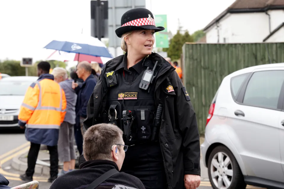 На фотографиите објавени од Дејли Мејл во вторникот, Ланкастер е забележана во униформа како патролира по улиците додека ковчегот на кралицата се возел до Бакингемската палата.