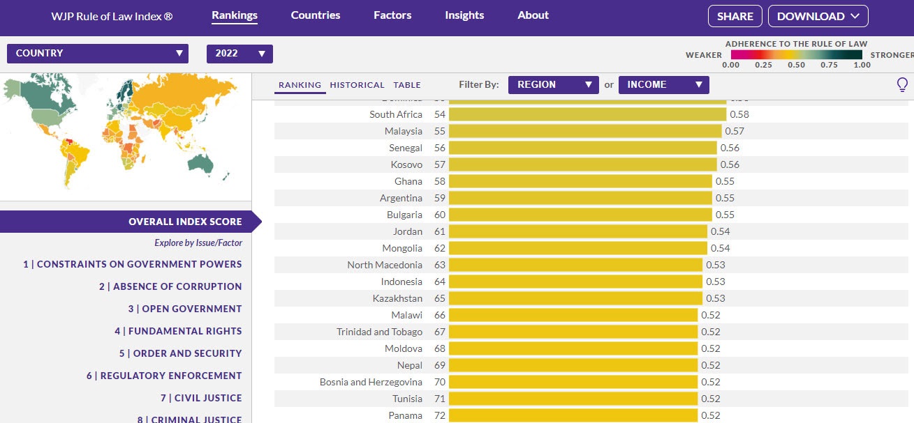 Од 2009 година, индексот на вашингтонската невладина организација „World Justice Project“ го мери развојот на владеењето на правото, врз основа на осум фактори: Ограничувања на владините овластувања, Отсуство на корупција, Отворена влада, Фундаментални права, Ред и безбедност, Регулаторно спроведување, Граѓанска правда и Кривична правда. За овогодинешниот Индекс на владеење на правото беа анкетирани повеќе од 154.000 домаќинства и 3.600 правни експерти.