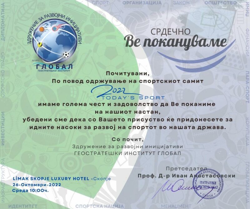 Со цел претставување на современите спортски трендови пред македонската јавност и креирање одредени насоки за подобрување на целокупниот спортски систем во државава, Здружение за развојни иницијативи ГИ ГЛОБАЛ го организира спортскиот самит „TODAY’S SPORT 2022“.