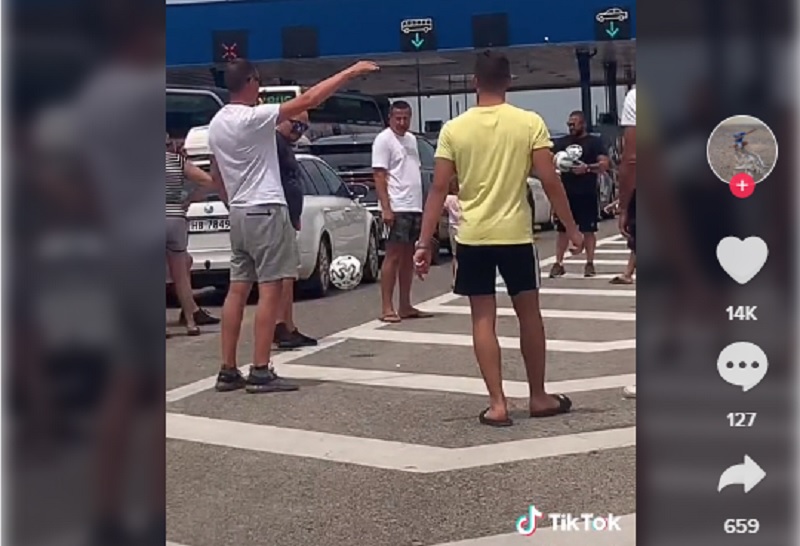 Еден TикТокер објави ситуација на граница каде може да се видат неколку мажи како играат фудбал среде метеж од автомобили.