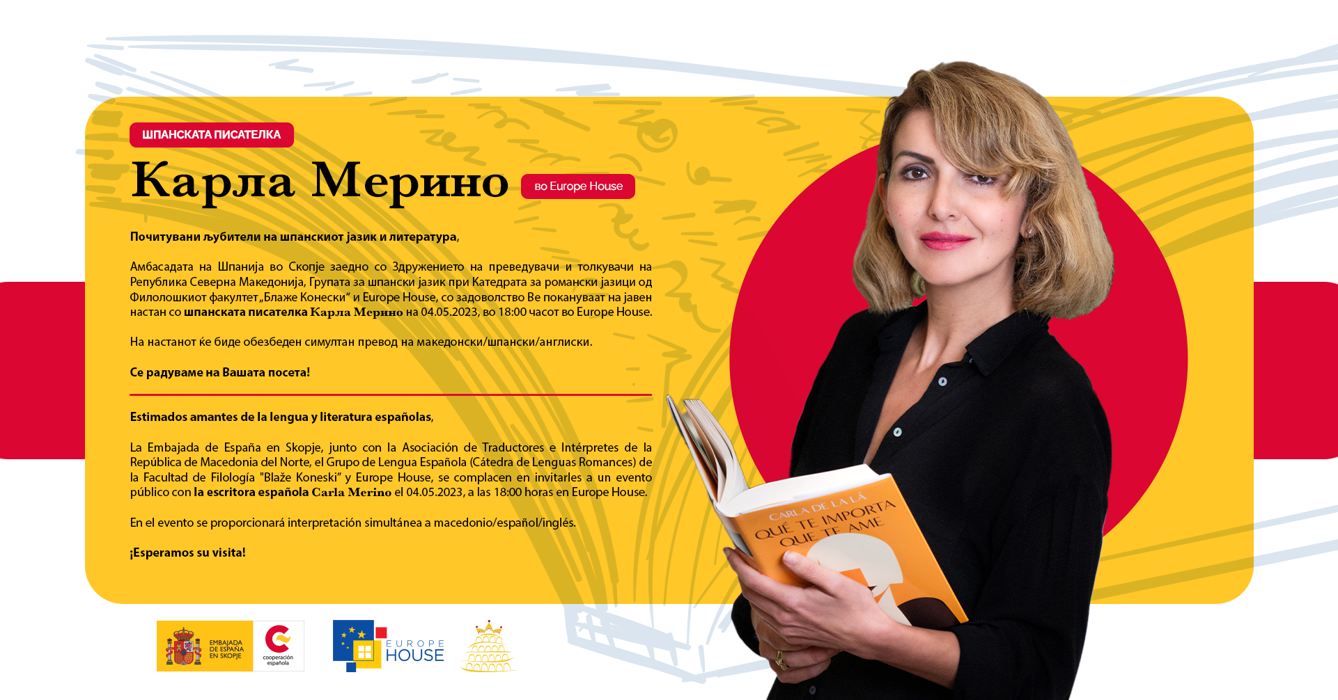 Амбасадата на Шпанија во Скопје, заедно со Здружението на преведувачи и толкувачи на Македонија, групата за Шпански јазик при Катедрата за романски јазици од Филолошкиот факултет „Блаже Конески“ во Скопје и Europe House, канат на јавен настан со шпанската писателка Карла Мерино на 4 мај во 18 часот во Europe House.