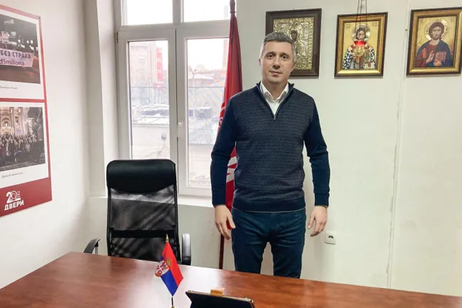 Меѓутоа, многу помладиот српски националист, 45-годишниот лидер на партијата Двери („Врати“), Бошко Обрадовиќ, беше подготвен да разговара. Отидов во централната канцеларија на неговата партија, каде што на ѕидовите беа обесени фотографии од некои клучни моменти од историјата на Двери. Имаше простор и за Русија: на една фотографија се гледа како Обрадовиќ позира покрај режисерот Никита Михалков, додека на другата е прикажан Путин на руското езеро Селигер заедно со активист од Двери.Обрадовиќ не сака да се нарекува себеси националист.