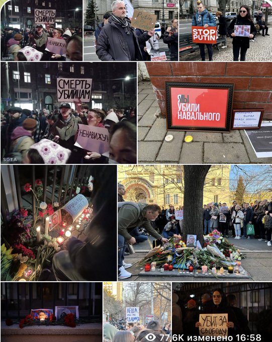 Стотици луѓе се собраа попладнево пред руската амбасада во Белград да изразат жалост по смртта на рускиот опозиционер Алексеј Навални во затвор. Луѓето полагаат цвеќе и плачат, а се слуша и руска музика.